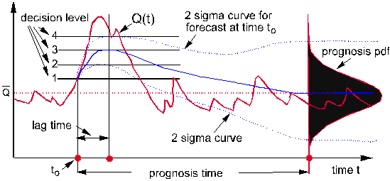 ![]() Fig. 1: Schematics of flood forecasting – with decision levels included Of critical importance is the lead time, which is the time interval between the making of a forecast of an extreme event, and the time when an extreme event occurs, as is illustrated for flood forecasting in fig. 1. In hydrology, the process of forecasting is a process of decision making under uncertainty, because of the impossibility of the exact prediction of an extreme event. This is illustrated by the error bounds indicated in fig. 1 If the lead time is too long, the forecast becomes meaningless, except as a prediction method for a rare event to be used in design of measures for protection against extreme events – building reservoirs to alleviate droughts, for example, or dikes to protect against floods. The shorter the lead time, the better the forecast, but the less time is available for action. Because floods and droughts are extreme meteorological events, a good forecast of weather extremes is a good basis. But for floods, the length of the lead time depends not only on the weather forecast, but also on the size of the catchment. The larger the catchment or basin upstream of the point of forecast, the longer the lead time becomes, so that the forecast of floods, for example on the river Rhine for the City of Cologne, can be done with a much longer lead time than the forecast for an alpine village in a small catchment basin subject to flash floods from very local thunderstorms. It is the task of scientists to devise methods of more accurate and earlier weather forecasts, better use of the weather forecast in hydrological models, and better methods of rapid communication of forecasts to decision makers. However, uncertainties can never be avoided. Therefore, an early warning system has to be based on a proper balance between the lead time and the uncertainty of the forecast. People falsely alarmed of an extreme event that did not occur will pay less attention to the next early warning. In practice, this is accomplished by a warning in stages, as is indicated for floods in fig. 1. This figure is based on the practice in Germany. The earliest warning may come from the weather service, upon which the flood forecasting group makes its first forecast. If the forecast indicates that a level of criticality might be reached, they issue a first warning. This forecast has a low accuracy and goes only to low local administrative levels, to make sure that water officials and employees are standing by. With an increase in forecasting accuracy, and with increasing certainty that a critical level will be exceeded, higher level decision makers get involved, and when an extreme threat to the population may indeed be expected, the highest ranking official of the region may be alerted to issue orders which affect the whole population, or which involves rescue and repair missions of more than a local nature. It is evident, that the last steps in the early warning chain, the disaster management strategy, is common to many types of disasters, and therefore, the local fire brigades are the natural helper in cases of flood emergencies, as well as for the case of droughts, where they have to provide the distribution system for emergency water supplies – if the water shortage ever reaches such a low level that this service is needed. It is concluded, therefore, that one of the most important lessons from the decade is that voluntary units of potential helpers are created in regions endangered by extreme natural events, and that these helpers are trained to manage all types of disaster which might occur. Hazard maps and appropriate rescue materials and equipment must become available to allow the effective training and operation of these units. |